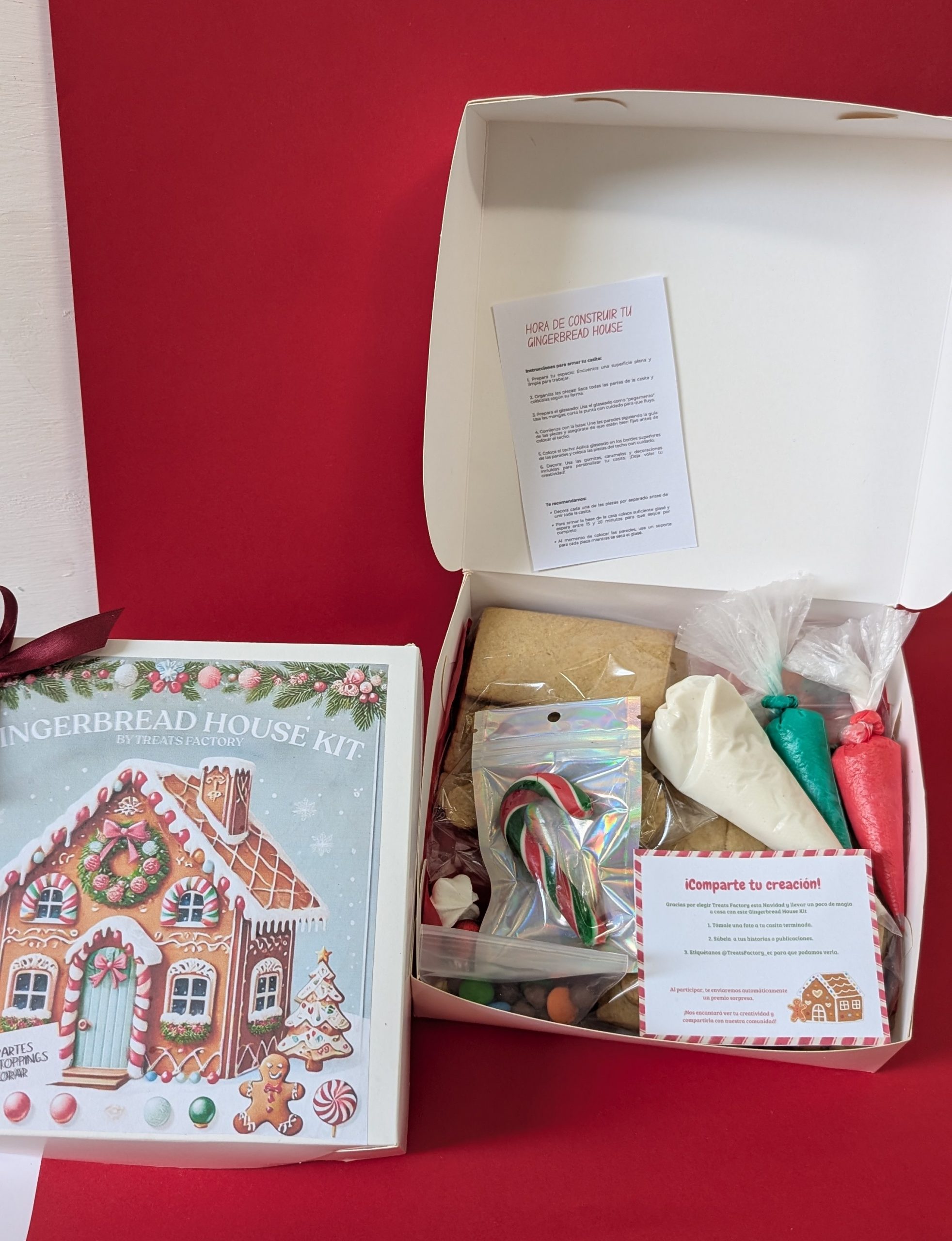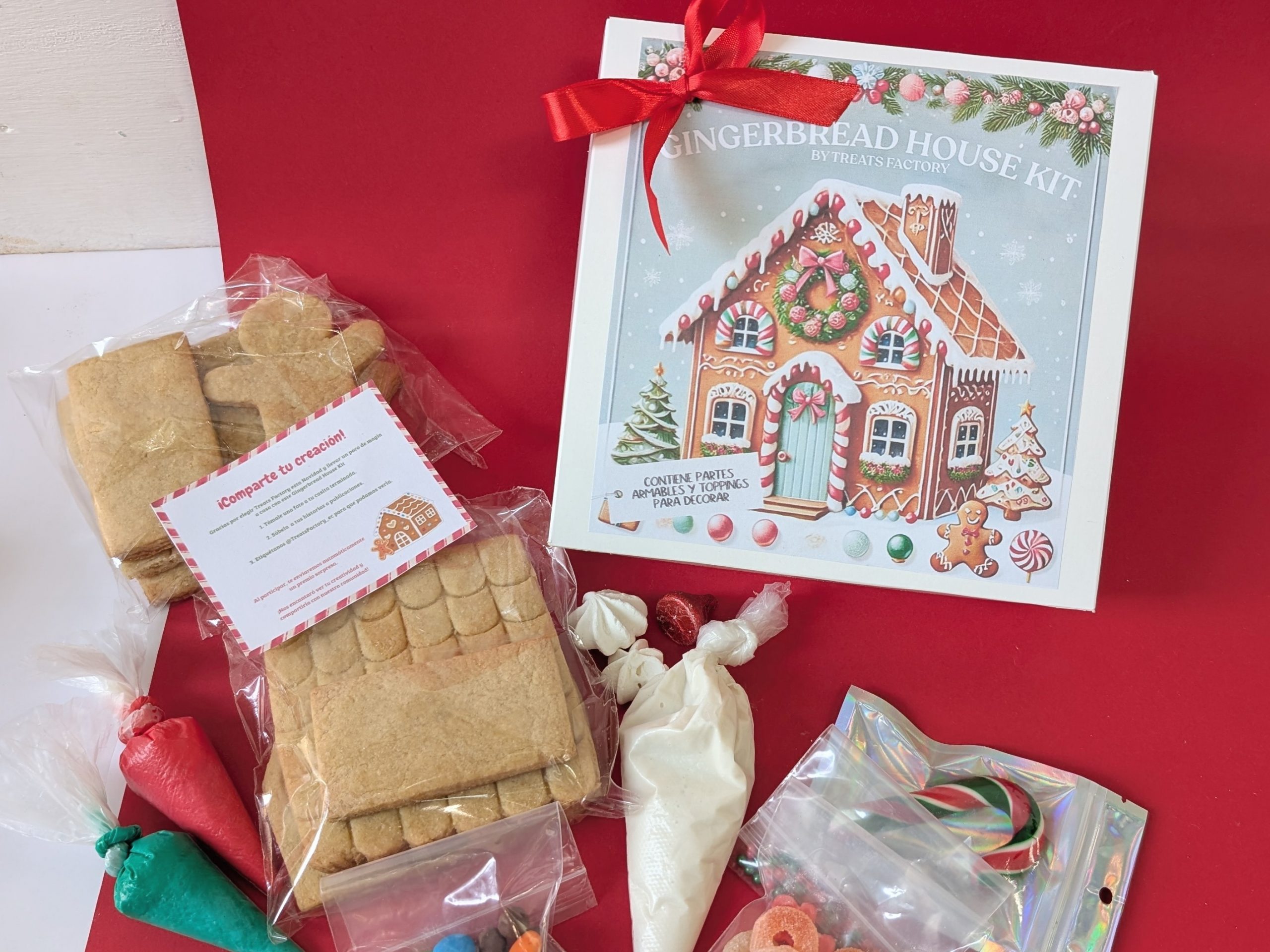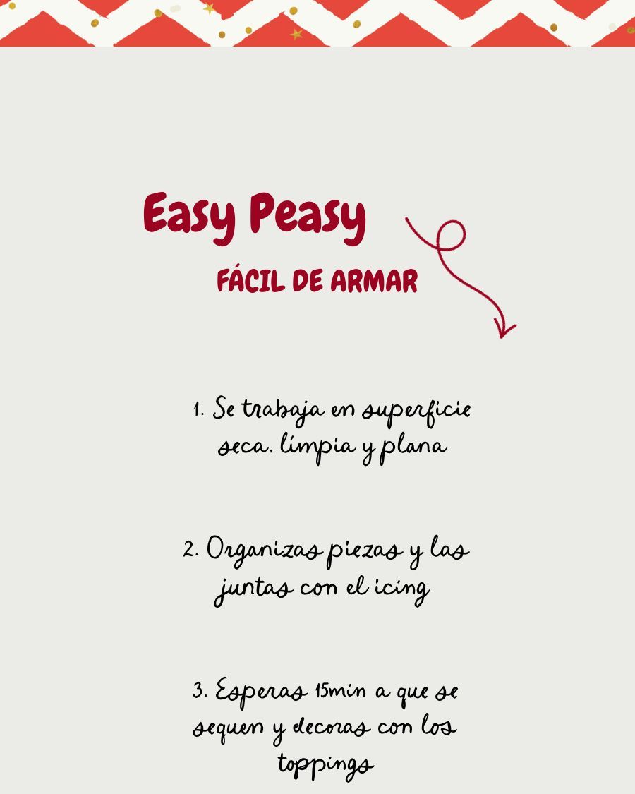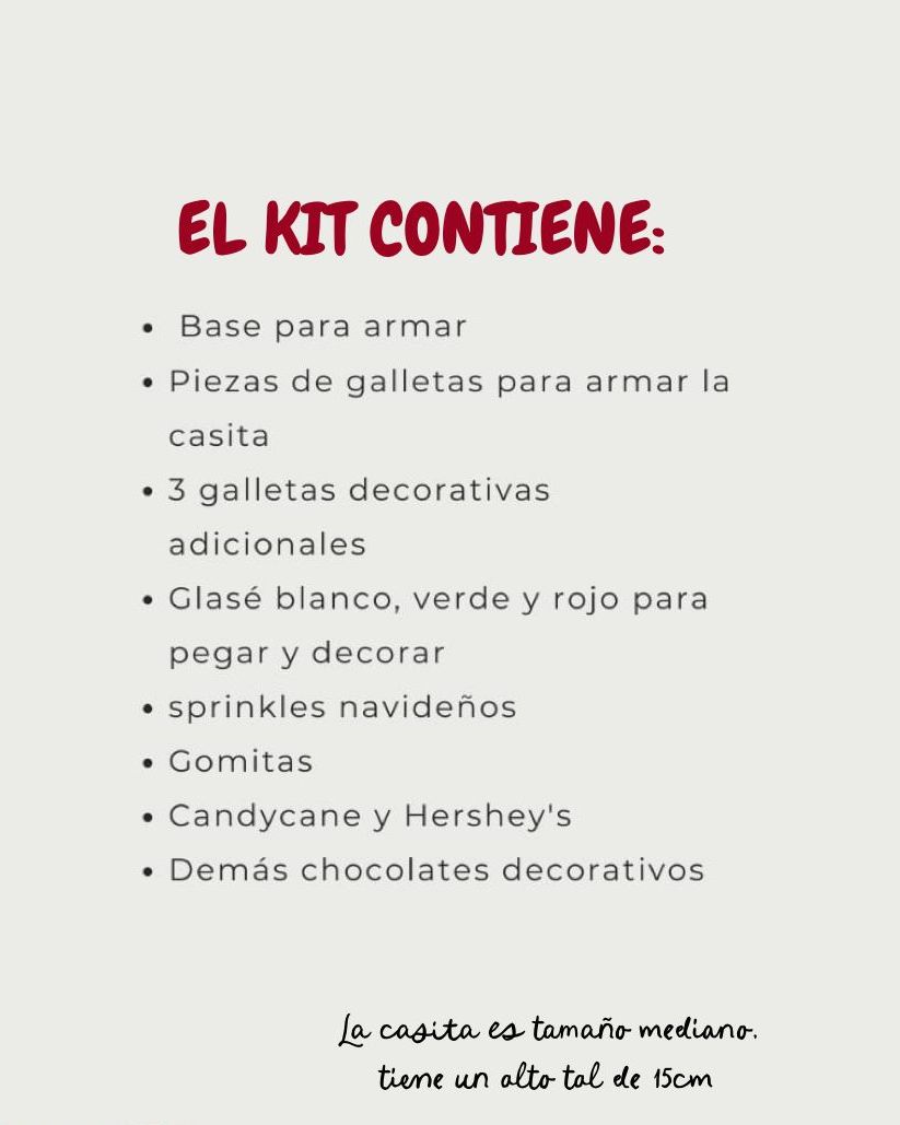 Nuestra casita de jengibre viene lista para que la armes y te diviertas. El kit incluye todas las piezas horneadas, glaseado y dulces para decorarla como quieras. Es una actividad perfecta para hacer en familia, compartir con amigos o dar como un regalo especial en Navidad.